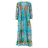 Vivid turquoise flower print with black leopard background. Buttoned V neck embellished with beaded flower motifs. Length midi