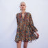 Roman stained window print, collarless neck line. Bodice is embellished with beading. Tasselled sleeves and hemline.